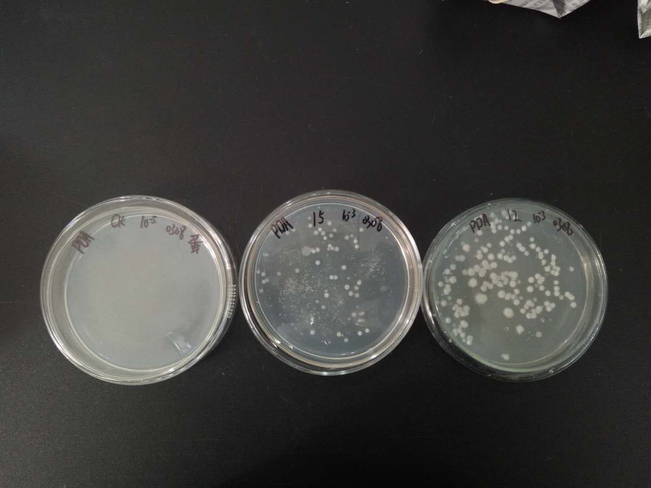沃土實驗室對前期寄送的樣品進行了多項指標的測定,并進行了菌劑接種和保存試驗。試驗基質(zhì)中接種了沃土的15個菌種,經(jīng)過30℃的恒溫培養(yǎng),1天后均繁殖出了菌落,其中尤以接種9號、10號和12號菌種的培養(yǎng)基質(zhì)菌落數(shù)量最多,而對照組(未接種菌劑)的基質(zhì)中沒有菌落出現(xiàn)。